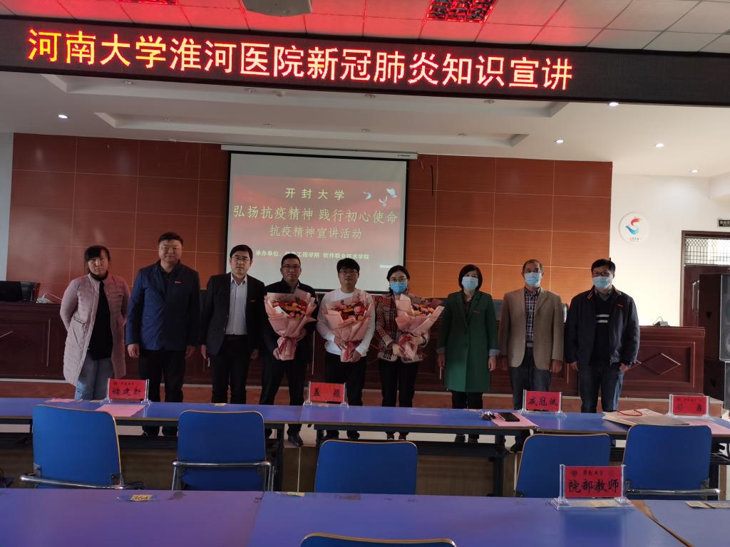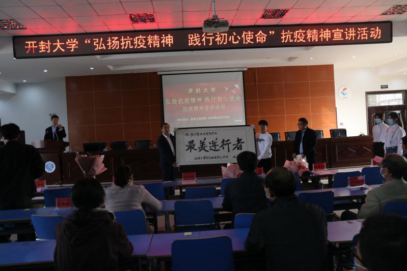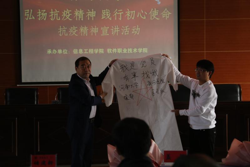 宣讲活动在激昂雄壮的国歌声中开始。与会来宾、领导和师生共同默哀悼念在抗击新冠疫情斗争中牺牲的烈士和逝世同胞。储书记代表学校向李国杰、盖颖、戚冠斌医生的莅临表示了热烈的欢迎,向戚冠斌医生一起白衣执甲、逆行出征的医护人员们表达了崇高的敬意,并号召老师们和同学们学习戚冠斌医生等抗疫战士的英雄精神;学习他们对党和人民的坚定信念;学习他们勇于担当、无私奉献的可贵精神;学习他们坚持不懈、埋头苦干的精神品质;学习他们攻坚克难克敌制胜的过硬本领,自觉的把“小我”融入“大我”积极磨炼,锻炼能力,争当先进、勇建新功,以不懈的奋斗为青春增添一抹亮丽的底色,以优异的成绩向建校40周年献礼。储建新向河南大学淮河医院援鄂医疗队赠送了书法家撰写的牌匾,淮河医院援鄂医疗队向bat365在线官方网站捐赠援鄂医疗队队员签名的医护服。