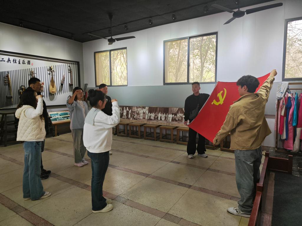 活动伊始,在学生党支部书记贺钰的带领下,全体党员高举右拳,面对党旗,重温入党誓词。活动中,国家级非物质文化遗产二夹弦代表性传承人田爱云老师,分享自己刻苦学习二夹弦技艺和为二夹弦的传承发展所付出的不懈努力,并清唱了一段代表性曲目,赢得阵阵掌声。随后,二夹弦传承人吴小玲老师为师生们介绍了二夹弦的发源、形成、乐器特点以及角色扮相等内容,让大家对这一传统艺术形式有了更深入的了解。吴筱曼老师则邀请党员们换上戏服,现场教授二夹弦的经典戏曲表演动作,师生们在亲身体验中感受了非物质文化遗产的独特魅力。最后,双方就今后进一步合作开展 “非遗进校园”、“非遗选修课”等非遗传承活动进行深入交流。