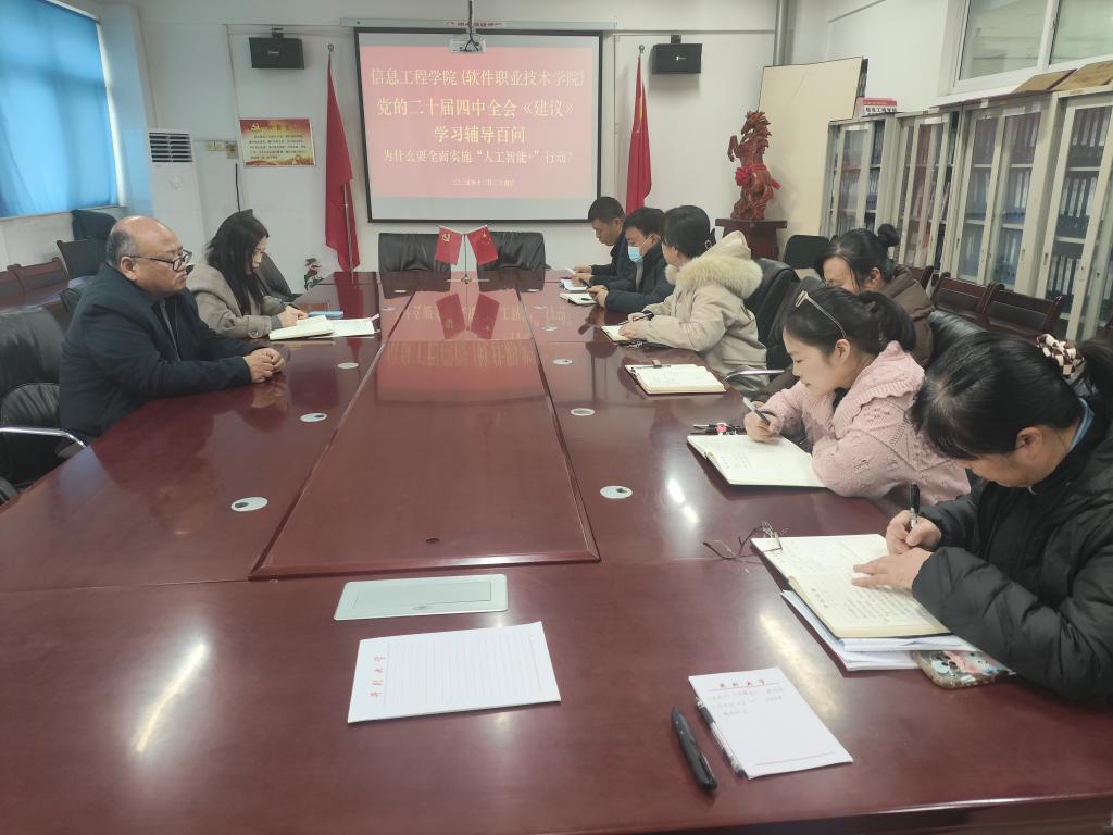 会议开始,党总支书记武莹领学《论教育》中《不断开创新时代思政教育新局面》一文;党总支宣传委员陈丽领学《习近平谈治国理政》第五卷中的《朝着建成教育强国目标扎实迈进》;学生支部书记贺钰围绕《党的二十届四中全会<建议>学习辅导百问》,重点领学《为什么要全面实施“人工智能+”行动?》章节。随后,陈丽、贺钰围绕学习内容进行了交流发言,武莹做总结发言。