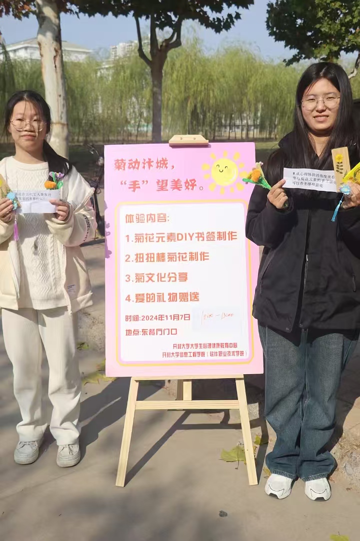 本站讯 为了帮助同学们缓解心理压力,提升心理健康水平,同时弘扬菊花文化,增强大学生文化素养和创造力,11 月 7 日,信息工程学院、软件职业技术学院在东餐厅门前成功举办了以“菊动汴城,‘手’望美好”为主题的心理体验活动,近200人参与了此次活动。