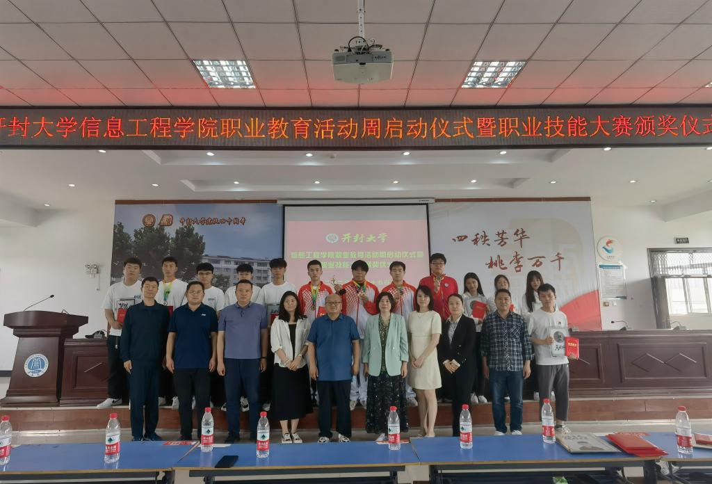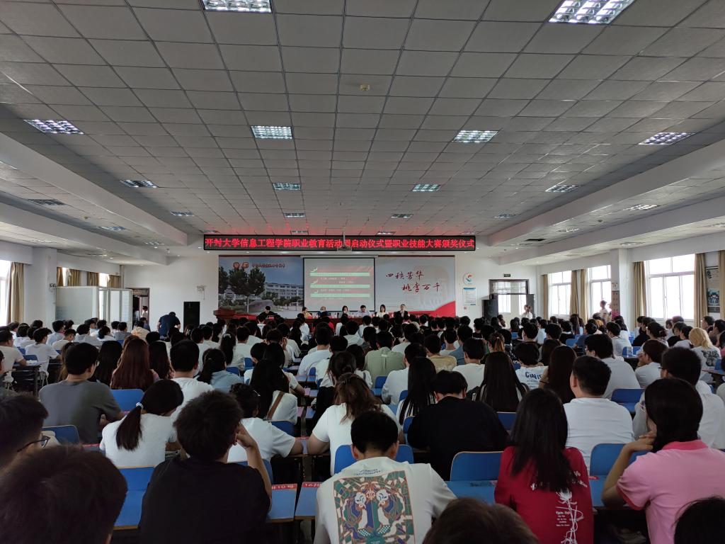 5月15日下午,信息工程学院在土木六楼报告厅举行职业教育活动启动仪式暨职业技能大赛颁奖仪式。教务处处长杨桦,学院党总支部书记袁震,院长张新成,副院长李响,王晓婷,新思齐公司企业方代表,学院教师、技能大赛获奖学生以及学生代表参加了仪式。