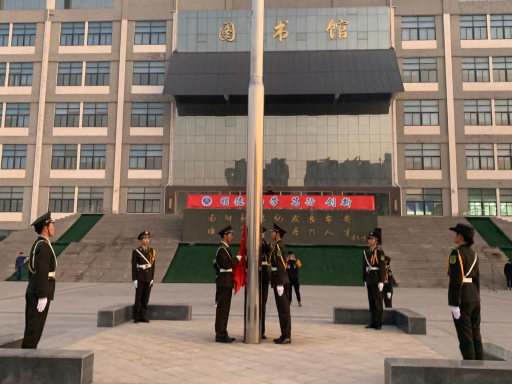 迎着朝阳,国旗护卫队迈着铿锵整齐的步伐将国旗护送入场。伴随着激昂雄壮的国歌声,鲜艳的五星红旗冉冉升起,迎风飘扬,全体师生肃立注目,表达对祖国的无限热爱与自豪。