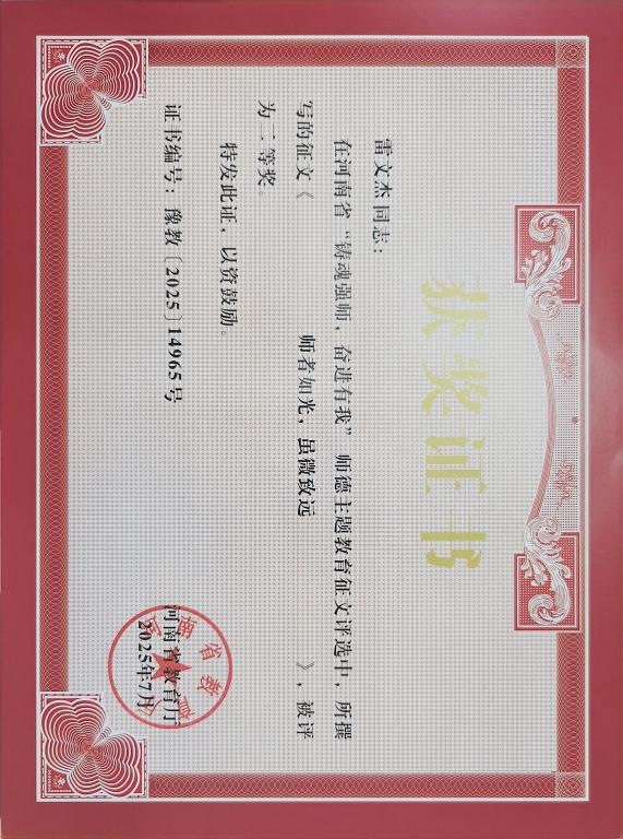 近日,河南省教育厅印发《关于公布“铸魂强师,奋进有我”师德主题教育征文、演讲比赛和师德师风优秀案例评选结果的通知》,我院在征文评选中荣获多项佳绩。其中,梁宏老师荣获一等奖,雷文杰老师荣获二等奖。
