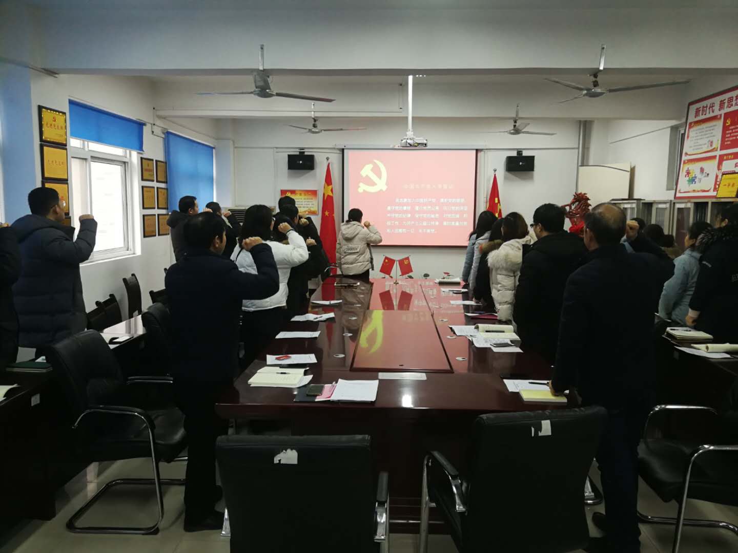 活动开始,全体党员在李林老师的领誓下,重温入党誓词。面对鲜红的党旗,高举右拳,字字铿锵,彰显了全体党员“不忘初心、牢记使命”的坚定政治信念。