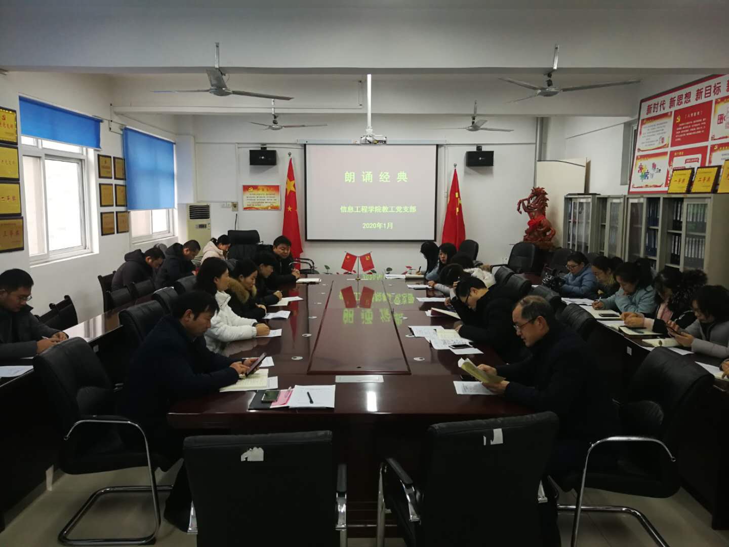 本站讯 1月11日下午,信息工程学院教工党支部在院部三楼会议室开展“不忘初心,砥砺奋进,共圆伟大复兴中国梦”一月份“5+N”主题党日活动。会议由教工党支部王娟书记主持。