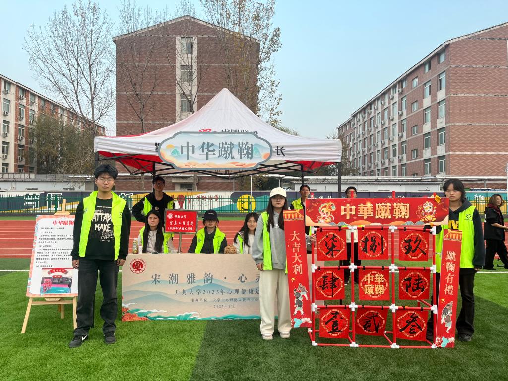 本次运动会特设宋文化体验项目,信息工程学院负责的“中华蹴鞠”备受青睐,同学们在精准射门中锻炼专注与心态。师生们还踊跃体验投壶、礼射等传统游戏,于古韵雅趣中学习心理调适。活动将体能竞技与心理健康教育深度融合,有效增强了团队凝聚力与心理韧性,为学子成长注入了“心”能量。