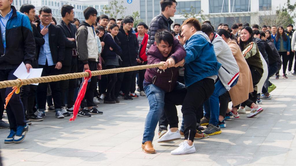 本次活动分为拔河比赛、跳长绳比赛两个集体项目和跳短绳比赛、踢毽子比赛两个个人项目。第一项拔河比赛刚刚开始,现场气氛就被推向了高潮,参赛的学生紧握长绳,卯足了劲拼命往后拉,同学们自发组成拉拉队,在队伍旁边为选手加油助威。比赛现场哨声、呐喊声此起彼伏,场面十分热烈。在跳绳比赛的现场,选手们也特别地投入。赛场外,各支队伍紧锣密鼓地开展赛前热身训练,赛场上,跳绳上下翻飞,队员们个个身手矫健,轻巧灵活,争分夺秒,充分发挥了自己的特长与团队的合作精神。踢毽子比赛则把所有人都带回了美好的童年。小小的毽子像一个个快乐的精灵,让同学们再一次感受了身心的愉悦。