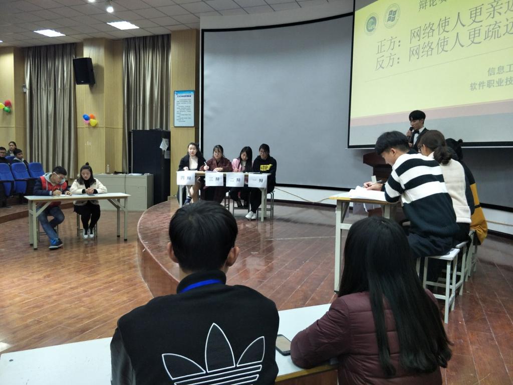 本站讯 为展示学生的语音风采,11月27日下午,信息工程学院在国际教育学院一楼报告厅举办了新生辩论赛决赛。进入决赛的两个班级分别是17级设施农业与装备1班和17级计算机应用技术3班。他们的辩题是:正方“网络使人更亲近”,反方“网络使人更疏远”