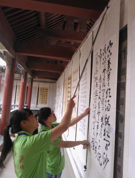 7月5日上午,艺术设计学院11名志愿者来到翰园碑林,为河南省第二十二届群众书法作品展布展服务。