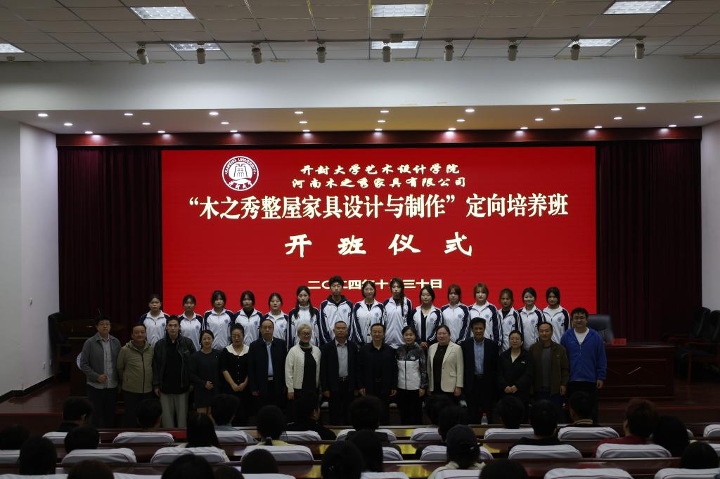 10月30日,bat365在线官方网站艺术设计学院与木之秀整屋家具设计与制作公司订单班开班仪式在行政楼第一会议厅举行。副校长李治、教务处处长王茜、产教融合服务中心主任师兆忠、河南木之秀家具有限公司董事长李鹏、总经理江霞、设计总监李萍、艺术设计学院党总支书记赵志成、院长张富云,环境艺术设计专业教师和全体环艺学生参加开班仪式,仪式由艺术设计学院副院长袁颖主持。