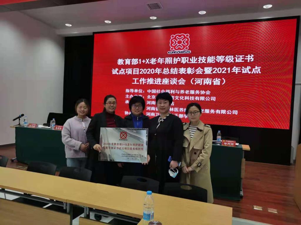 4月15日,由中国社会福利与养老服务协会指导、北京中福长者文化科技有限公司主办的教育部1+X老年照护职业技能等级证书试点项目2020年总结表彰会在河南省卫生健康干部学院召开。会上对2020年度老年照护职业技能等级证书试点项目给予组织周密、考试成绩优秀、积极参与的试点院校(河南省)进行表彰,bat365在线官方网站医学部获得优秀组织奖荣誉称号。医学部党委委员、副主任张素敏一行5名同志参加了本次表彰会。李娜老师作大会发言,分享了我院部1+X老年照护职业技能等级证书工作经验。