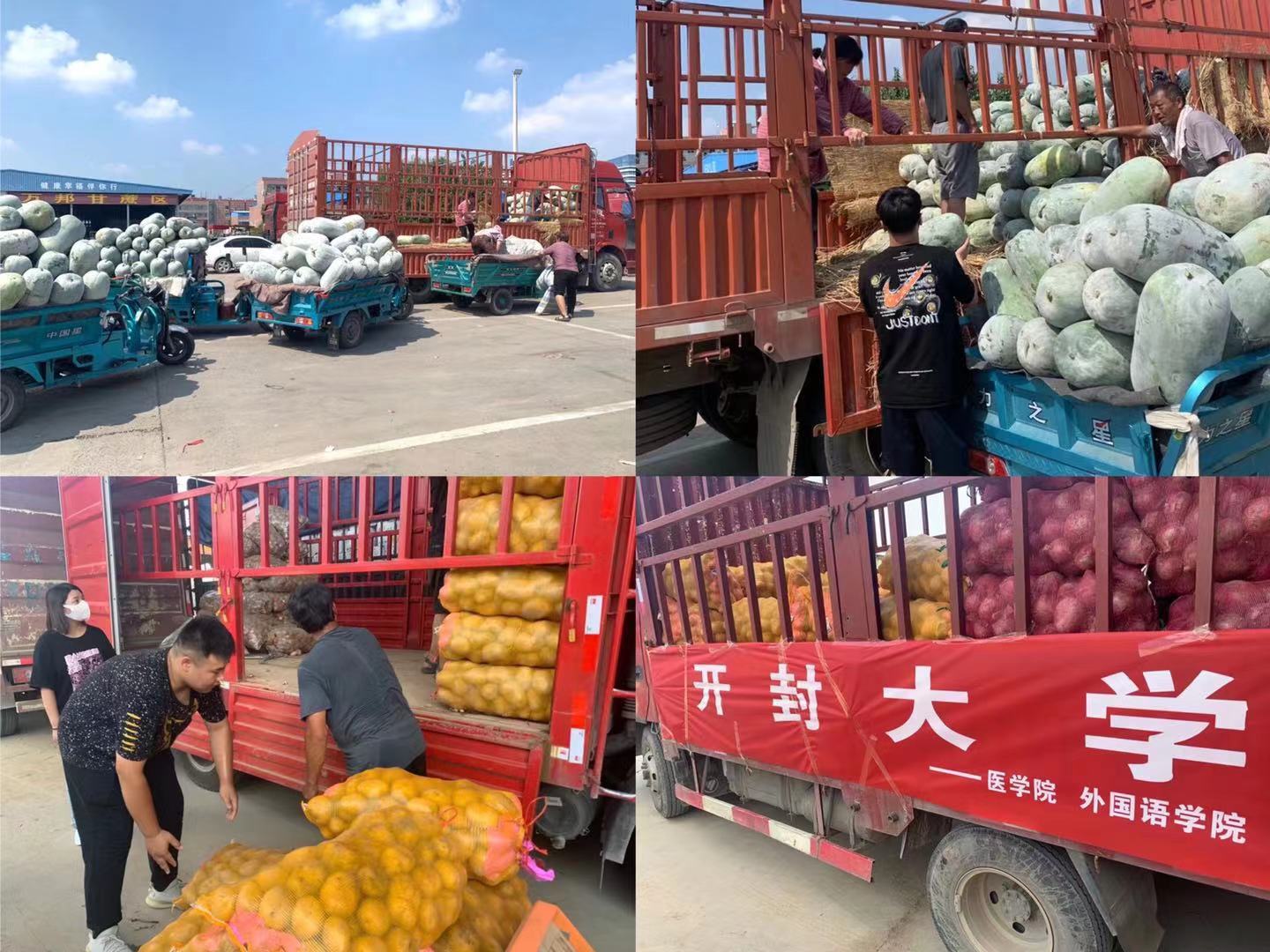 医学部20级影像专业王君豪同学7月25日早上5点20起床从驻马店上蔡县坐车到达郑州市中牟县万邦国际农产品批发市场和张子康等同学汇合,随即进行物资采购。下午14点张子康、王君豪等同学开始将西亚斯学院集资募捐和bat365在线官方网站医学部支援的土豆8000斤、冬瓜5000斤、白菜5000斤、洋葱3000斤、消毒水原液1吨(相当于100吨消毒水)不辞辛苦,历时三个多小时不停的装车,只为能快速把物资送到受灾人民的手中。搬好物资的张子康、王君豪等同学立即出发前往新乡市卫辉市,19点钟左右到达卫辉。卫辉市应急管理局的李开心帮助医学部的学子们进行了物资对接,保证顺利的送到受灾人民手中。