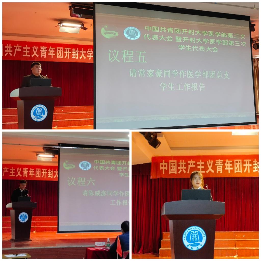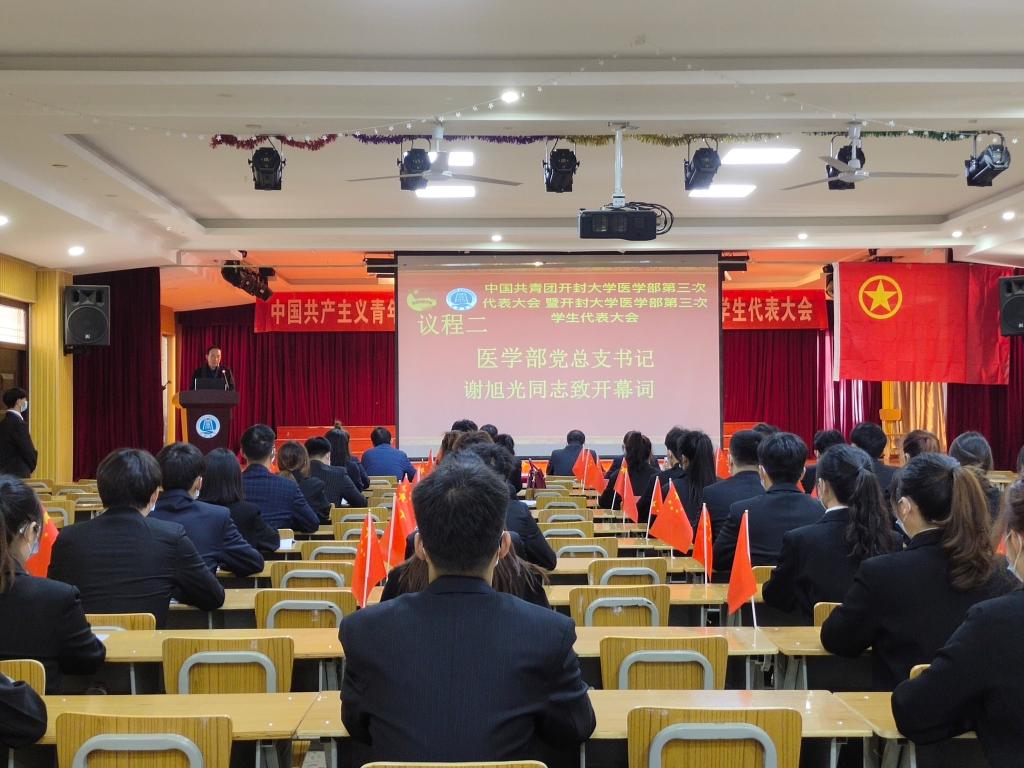十一月十一日,大会如期而至,bat365在线官方网站党委委员、开封市卫生学校党委书记曾小平、bat365在线官方网站团委书记刘圣亚、bat365在线官方网站医学部党总支书记谢旭光、bat365在线官方网站医学部学生党支部副书记厉从志、bat365在线官方网站医学部团总支书记崔俊莉以及辅导员老师们莅临了本次大会。窗外冬日骄阳明烈,室内国歌、团歌庄严响起。医学部各代表着装整齐,手持国旗,伴随着歌曲,齐声高歌。
