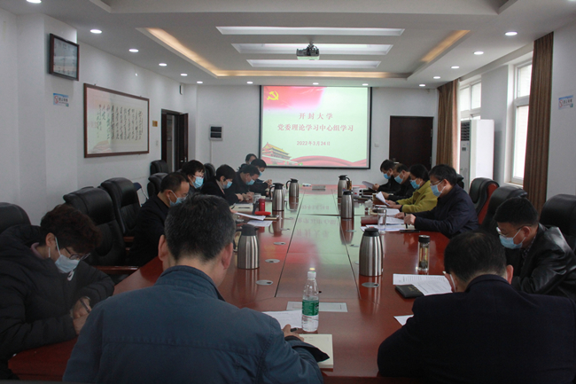 党委理论学习中心组集体学习了习近平对党的建设研究工作的重要指示、习近平在省部级主要领导干部学习贯彻党的十九届六中全会精神专题研讨班开班式的讲话、习近平谈防灾减灾、习近平在十九届中央纪委六次全会上的讲话、楼阳生在全省开展“能力作风建设年”活动动员部署会议上的讲话、2022年职业教育重点工作、《开封市落实“三重一大”事项决策制度实施办法》和全省职业教育大会精神。