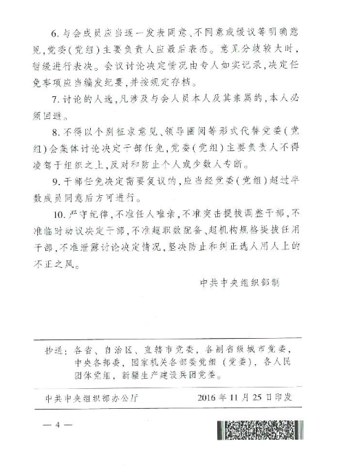 8.不得以个别征求意见、领导圈阅等形式代替党委(党组)会集体讨论决定干部任免,党委(党组)主要负责人不得凌驾于组织之上,反对和防止个人或少数人专断。