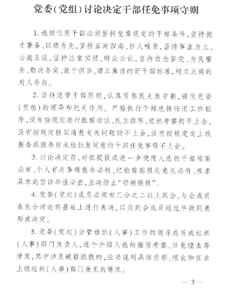 10.严守纪律,不准任人唯亲,不准突击提拔调整干部,不准临时动议决定干部,不准超职数配备、超机构规格提拔任用干部,不准泄露讨论决定情况,坚决防止和纠正选人用人上的不正之风。