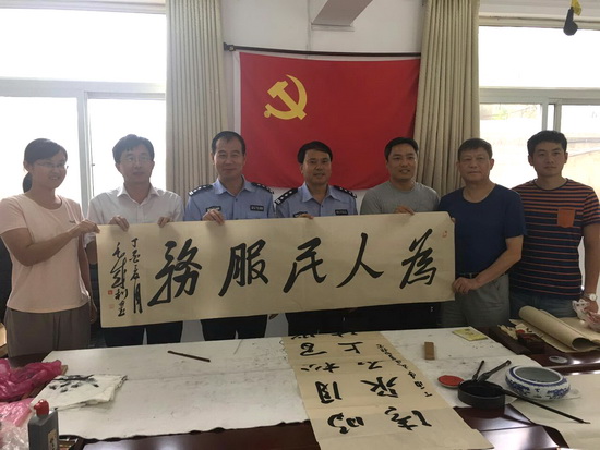 本站讯 为进一步加强警、校合作交流,增进双方友谊,巩固警民共建成效。7月27日下午,我校保卫处负责人、校书法协会骨干成员前往开封市公安局柳圆口分局开展警民共建慰问活动。