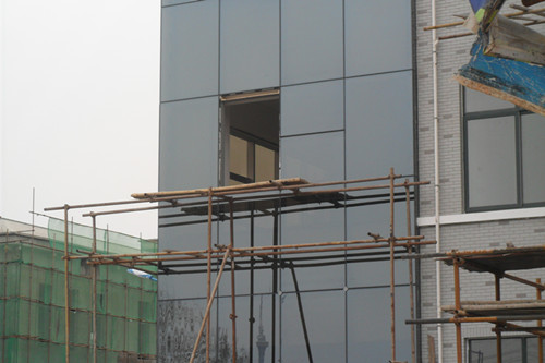 (一)国教楼内墙涂料、地板砖、踢脚线、卫生间瓷片施工中,幕墙玻璃开始拆卸(见下图)