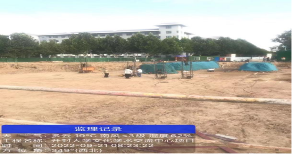 4、学术交流中心:完成围挡、临建、冲洗设备、钢筋加工棚、施工场地硬化、总配电柜、塔吊基础的建设工作。
