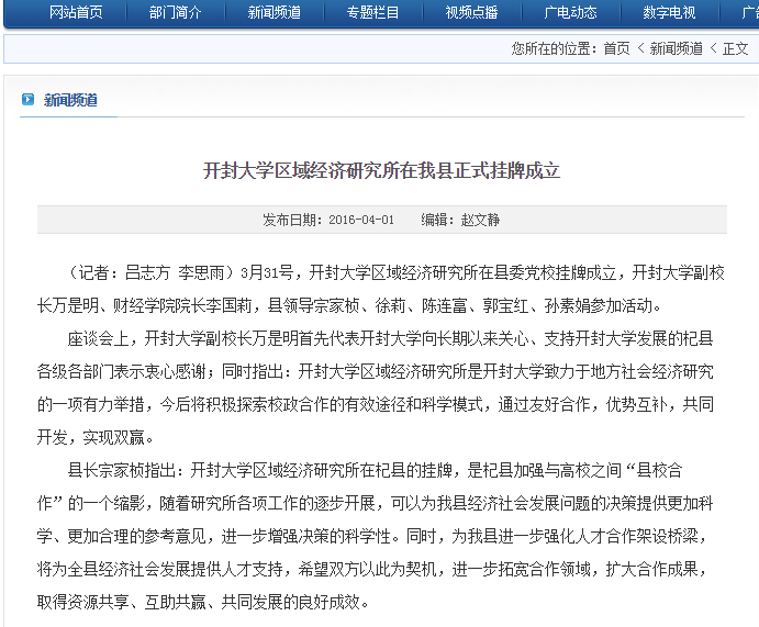 县长宗家桢指出:bat365在线官方网站区域经济研究所在杞县的挂牌,是杞县加强与高校之间“县校合作”的一个缩影,随着研究所各项工作的逐步开展,可以为我县经济社会发展问题的决策提供更加科学、更加合理的参考意见,进一步增强决策的科学性。同时,为我县进一步强化人才合作架设桥梁,将为全县经济社会发展提供人才支持,希望双方以此为契机,进一步拓宽合作领域,扩大合作成果,取得资源共享、互助共赢、共同发展的良好成效。