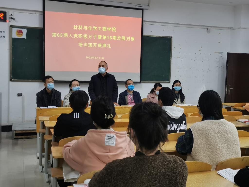 为贯彻落实开大党组发〔2022〕2号—bat365在线官方网站党校2022年上半年培训工作的通知要求,加强对入党积极分子和发展对象的培养、教育,确保党员发展质量,提高党员发展对象学习党的理论和贯彻党的路线方针政策的自觉性,材料与化学工程学院于3月14日晚7点在三号楼206教室举办第65期入党积极分子暨第16期发展对象培训班开班典礼。参加开班典礼的有党总支书记侯彦喜、副书记郝喜才,学生支部委员,21级辅导员以及第65期入党积极分子、第16期发展对象。开班典礼由学生支部书记陈彦霏主持。