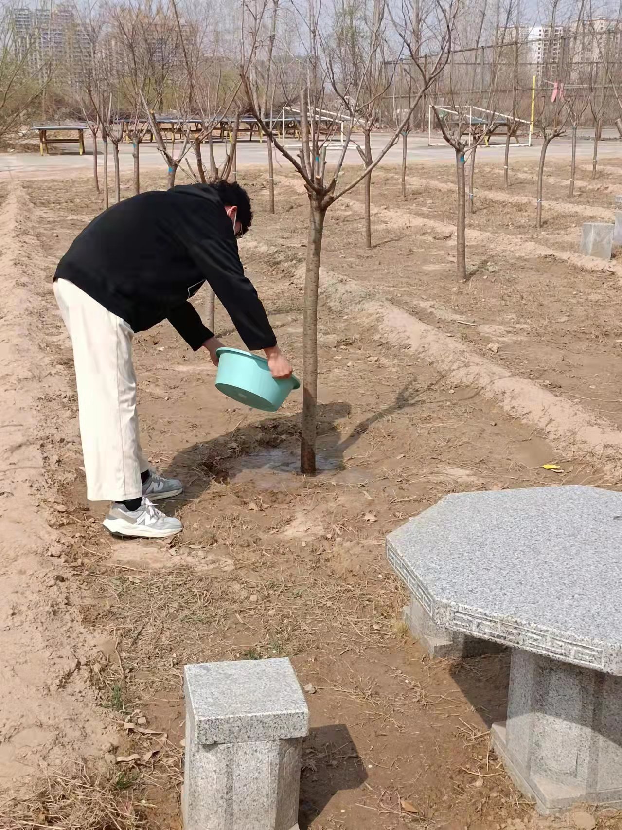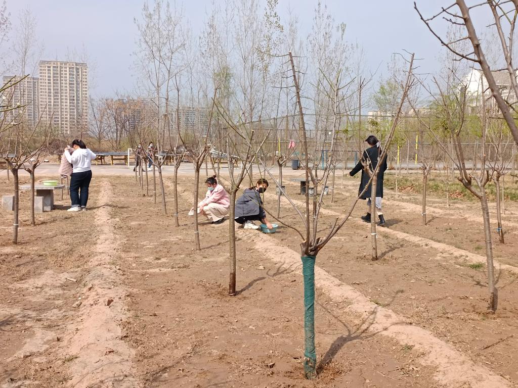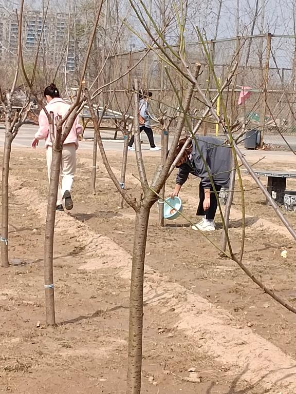 进入樱花园,同学们就感受到扑面而来的春天,心情一下就放松了很多。他们首先进行了简单分工,两两一组相互协作。接着,同组的一人拿着小铲子给树松土、铲杂草,另一人拿着从宿舍带来的盆、瓶子、桶等可以盛水的器具,积极的去打水浇树。他们配合默契,有说有笑,在劳动中释放了压力,在春光中感受了美好,很快就完成了浇树的任务。看着自己的劳动成果,大家心里特别的高兴,纷纷与自己的负责的树合影留念,记录自己在春光里爱上劳动的美丽模样。