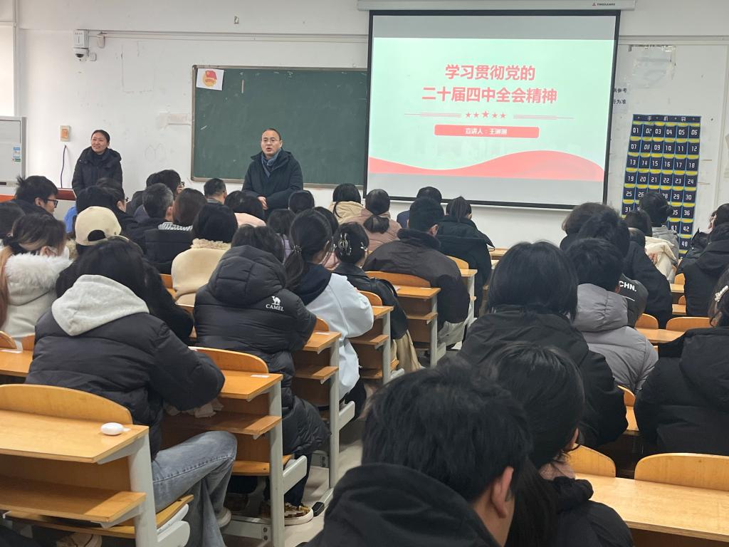 为深入学习贯彻党的二十届四中全会精神,推动理论学习与专业实践深度融合,12月30日,材料与化学工程学院在3号教学楼204教室举办专题宣讲会。学院邀请马克思主义学院王琳琳老师主讲,院党总支书记郝喜才主持会议,全体教师及百余名学生参加。