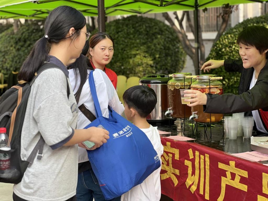 院部迎新区域设有院部概况、师资建设、专业介绍、特色签名等展板,并且配有休息区,实训产品展示区等特色服务。特别是实训展示区,配备专业老师亲自带领院部在校生制备的牛魔王奶茶、茉莉奶绿、缤纷水果茶、鸭屎香柠檬茶等饮品,泡芙、月饼、坚果曲奇、奶酥提子等点心,并配有解说员,真正做到茶香满园,情入点心。现场人声鼎沸、络绎不绝,新生及家长频频停足品尝,赞不绝口。