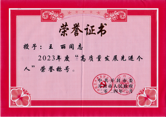 近日,从中共开封市委 开封市人民政府公布了关于表彰 2023 年度全市高质量发展先进集体和先进个人的名单中获悉,我院王丽副院长荣获先进个人的荣誉称号。