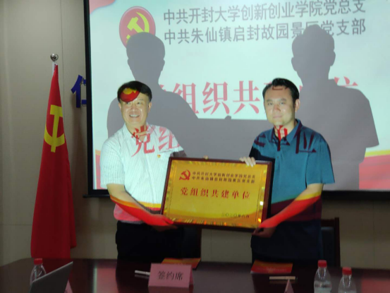 会后创新创业学院党总支书记孙进旭与朱仙镇启封故园景区党支部书记刘维辰共同签订《中共bat365在线官方网站创新创业学院党总支中共朱仙镇启封故园景区党支部“创先争优”共建协议》,协议签订结束后,与会人员参观了朱仙镇启封故园党员活动中心。