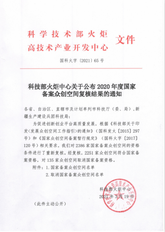 近日,接科技部火炬中心关于公布2020年度国家备案众创空间复核结果的通知(国科火字〔2021〕65号),我校“bat365在线官方网站众创空间”顺利通过科技部火炬中心2020年度国家备案众创空间复核,继续保留bat365在线官方网站众创空间国家备案资格。