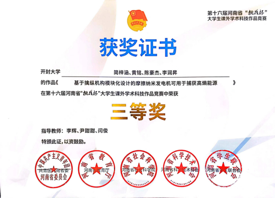 近日,由共青团河南省委、省教育厅、省社会科学院、省科协、省学联联合举办的第十六届“挑战杯”河南省大学生课外学术科技作品竞赛落下帷幕,我院99°创客空间简梓涵、黄铭、陈豪杰、李润昇四名同学参与完成的《基于擒纵机构模块化设计的摩擦纳米发电机可用于捕获高熵能源》项目在本次竞赛中荣获三等奖。