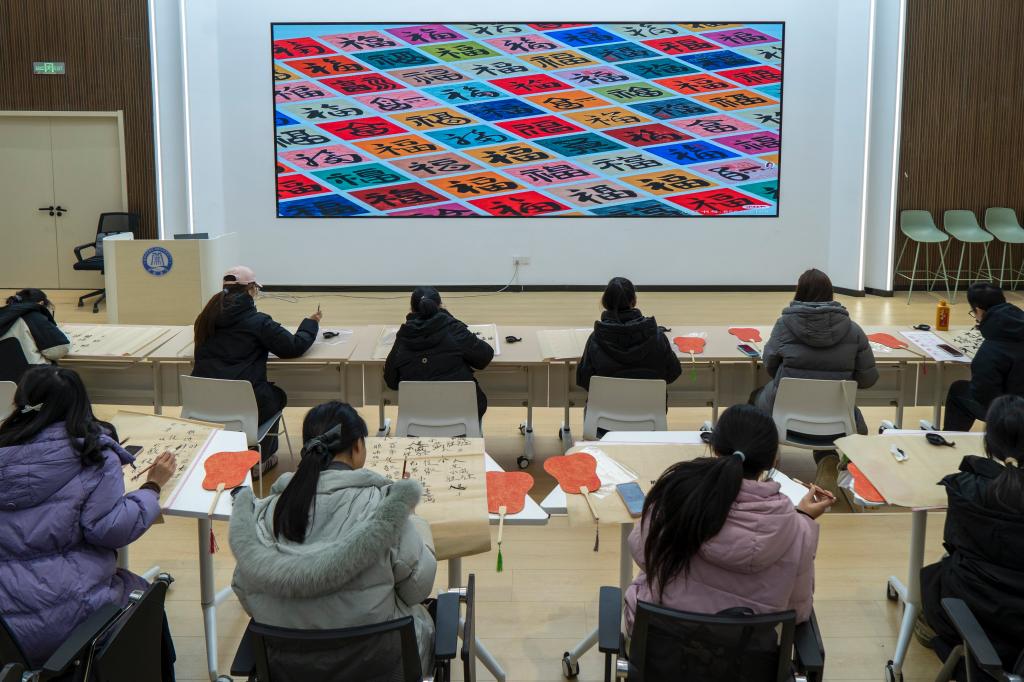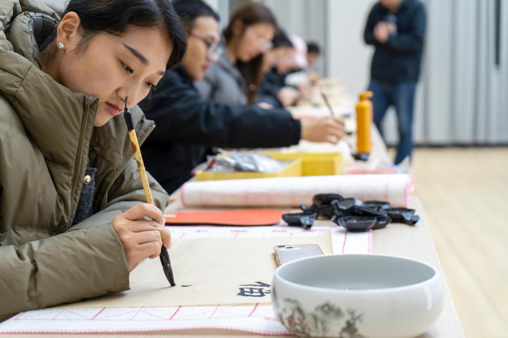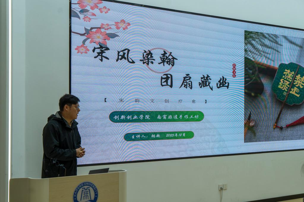 为深入推进创新创业教育与心理健康教育的融合贯通,12月23日晚,创新创业学院与大学生心理健康教育中心于17号楼503路演大厅共同组织开展了以非遗手作与心理疏导相结合为主题的特色教育活动。活动以宋韵文化为精神底色,以非遗团扇创作为载体,引导学生通过笔墨书写与手作体验,在宋风雅意中涵养心性、舒缓压力。活动由创新创业学院南窗非遗手作工坊负责人胡超老师带领,吸引了学生的广泛关注和积极响应,招募通知发布后限定名额迅速报满,最终共有20名学生参与体验。创新创业学院副院长刘中然、大学生心理健康教育中心黄春花老师到场指导观摩。