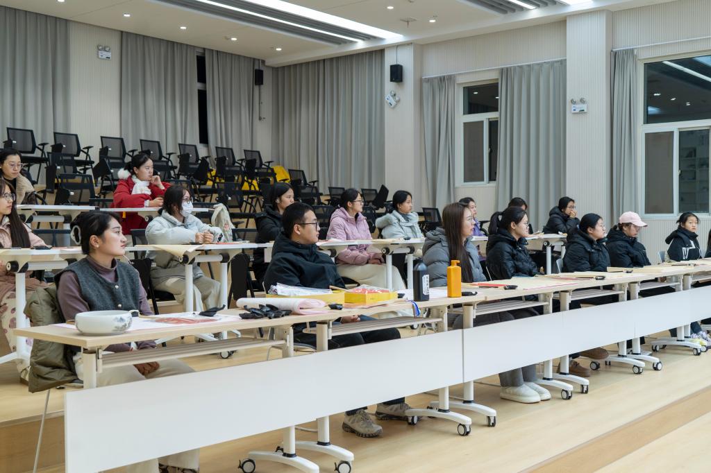 活动中,胡超老师分析了当前大学生面临的主要压力来源,引出宋代文人“以艺养心”的生活美学。他指出,宋代不仅是中国文化的高峰,也在书法、绘画、器物中融入了“格物致知”“静观内省”的哲学思想,同时强调创作过程中的自我表达与身心投入,鼓励学生将内心感受转化为艺术语言,在专注创作中缓解压力、沉淀心境。活动现场气氛融洽。