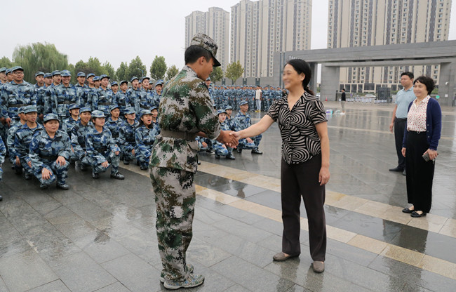 9月11日下午,校党委书记陈灿、校工会主席成芳带领学生工作部领导及相关工作人员冒雨来到图书馆大观广场慰问正在参加军事训练的19级新生和全体教官。