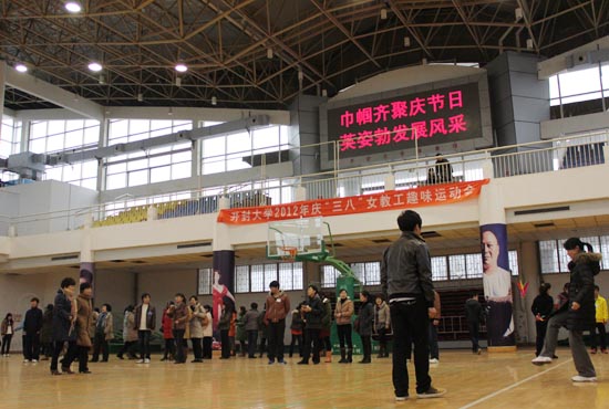 3月8日下午,学校工会精心组织了2012年庆“三八”女教工趣味运动会,全校女教职工热情高涨,此次活动使全校的女教职工陶冶了情操,愉悦了身心,展现出了学校女教职工良好的精神风貌,使女教职工感受了学校的关怀与爱护的同时也营造了浓郁的节日气氛。