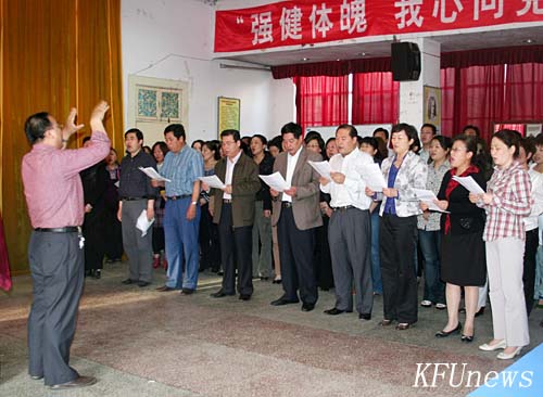 本站讯 为了能以出色的表演向党的90诞辰献礼,在学校组织的“党在我心中”师生同唱红歌比赛中取得优异成绩,学校各参赛队正加紧排练,每天在校园里都能听到师生合唱红歌的嘹亮歌声,校内掀起了唱红歌高潮。校领导也参加到歌咏比赛联队的排练行列,和大家一起认真排练红歌,使歌咏比赛联队队员很受鼓舞。