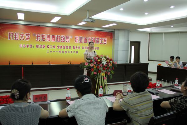 6月22日下午,我校在行政楼二楼会议厅举办“我把青春献给党”职业道德演讲比赛活动。全校各分工会共有22名教职工选手参加了演讲比赛。校领导万是明、赵辉、范金梅、何世玲、耿广利、成芳,全体工会委员,各分工会主席,教职工代表聆听了全场演讲比赛。