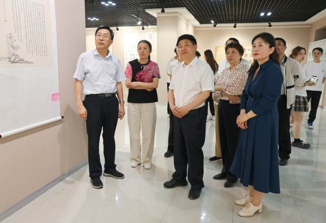 教职工书画展在艺术设计学院二楼西展厅展出,共有60余件作品,艺术地展现了我校教职工昂扬向上的精神风貌和美好的生活愿景。王德如边参观边与作者代表交流书画技法技艺,分享感受。