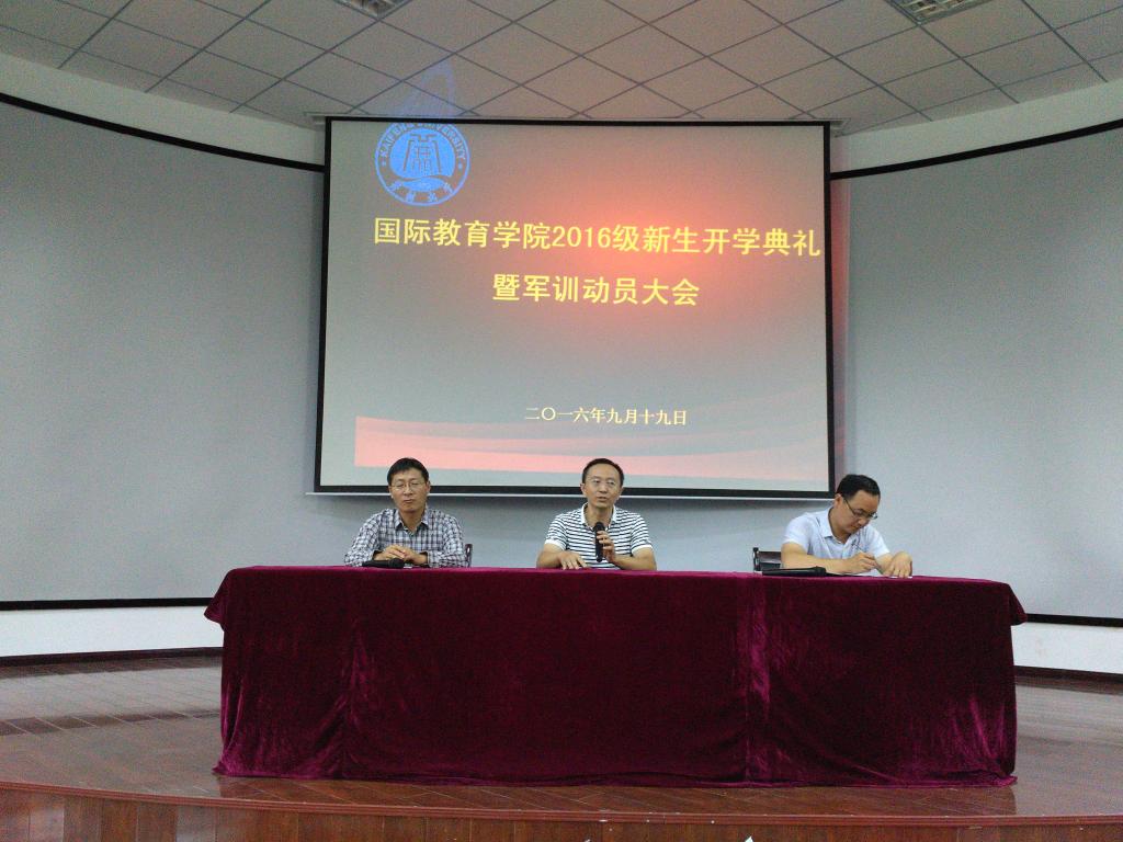 国际教育学院于2016年9月19日上午在5号楼报告厅举行新生入学典礼,bat365在线官方网站副校长兼国教学院院长李治老师、国教学院党总支书记王玉杰老师、国教学院副院长袁长征老师、国教学院办公室主任沈二波老师、团总支书记新生辅导员刘青老师以及学院专业教师们出席了会议。