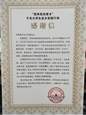 国际教育学院学生积极参与千名大学生返乡实践行动,18会计班吴博同学荣获共青团开封市委“我和我的家乡”千名大学生返乡实践行动“优秀个人”称号;18会计班张淼同学获共青团舞钢市委“返家乡、到基层、共抗疫”大学生寒假社会实践活动先进个人称号,为学院争得了荣誉。