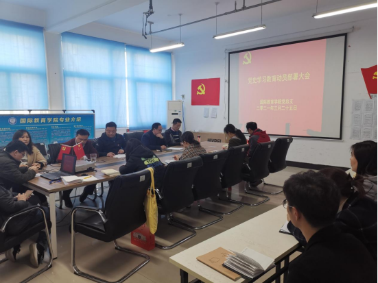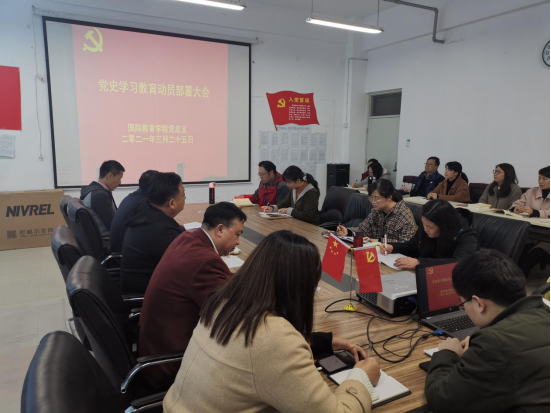 325日下午,国际教育学院党总支召开党史学习教育动员部署大会,全体党员参会。蒋大山同志首先宣读国际教育学院党总支党史学习教育实施方案,说明了党史学习内容、三个阶段学习进度安排以及多样化学习形式的要求。陈力同志传达了学校党史学习教育动员部署大会的精神,特别是陈灿书记对开展党史学习教育提出的三点意见:第一,弘扬优良传统,坚定政治自觉,深刻理解开展党史学习教育的重大意义。第二,汲取历史智慧,凝聚发展力量,不折不扣落实党史学习教育的重点任务。第三,加强组织领导,立足工作实际,高标准高质量推动党史学习教育扎实有序开展。最后要求所有党员同志要充分认识到学习党史的重要性,不折不扣落实党史学习任务,促进学院各项工作开展,为学校的“双高”建设和升本事业做出贡献。