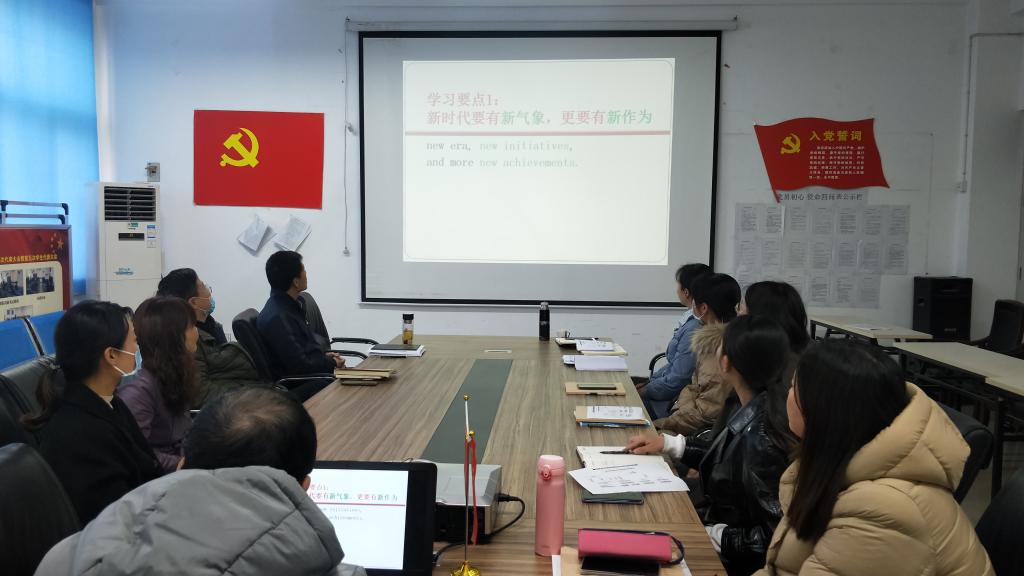 首先是重温入党誓词,由黄艺琴同志带领全体党员宣读誓词。其次是诵读经典,由院党总支书记陈力同志带领学习全国“两会”精神;然后,由宋达华同志带领学习习近平《论中国共产党历史》并谈体会。会上,支部党员集中交纳当月党费,并公示了2月份党员积分情况。作为“附加动作”,进行了学院特色理论学习活动——双语学习《习近平谈治国理政》第四期,本期主讲孙超同志带领大家继续开展双语理论学习。