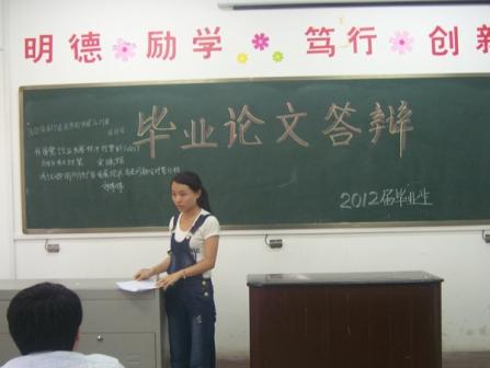 国际教育学院2012届毕业生于5月30日至31日在国教楼204、205、206教室进行了毕业论文答辩。答辩委员会由包括院领导在内的专业教师组成,答辩毕业生按专业分组,国际金融专业毕业生于30日下午三点答辩,工商企业管理专业毕业生分别于30日下午三点及\31日上午九点答辩。在论文答辩环节中,各专业毕业生按照要求积极充分准备,严格遵守答辩程序较好的完成了毕业前的一项重要环节。