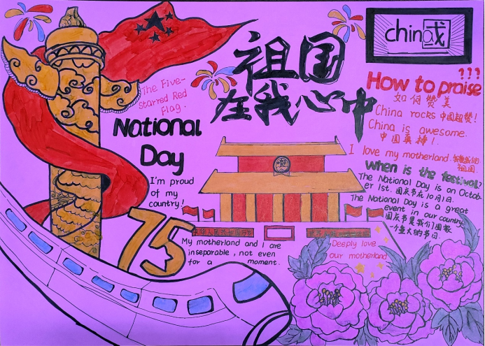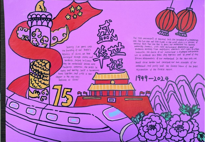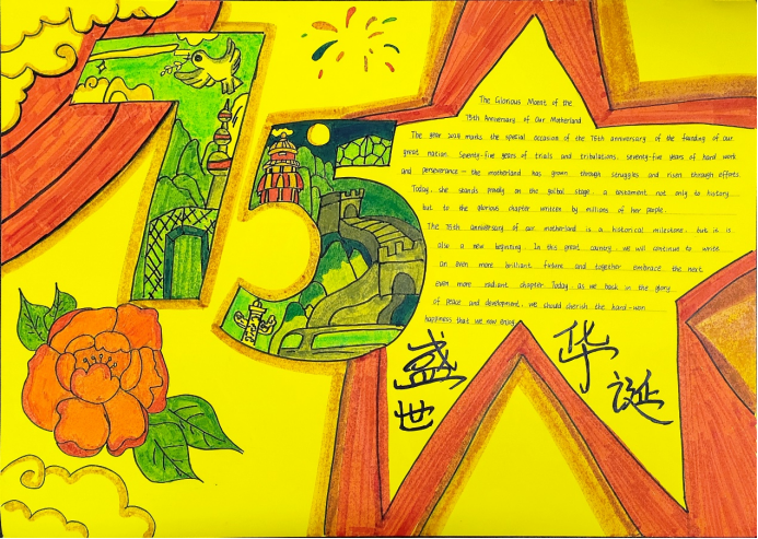本届英语手抄报大赛以“庆祝新中国成立75周年华诞”为主题,由学院2024级全体学生参与,以小组为单位,通过手抄报,展示中华儿女的拳拳爱国之情,将学子的真挚祝福献于新中国成立75周年华诞。比赛分为初赛和复赛两个阶段,综合班级投票,学院全体老师投票以及评审团评审,最终评选出一等奖2组,二等奖4组,三等奖6组和最佳人气奖3组。