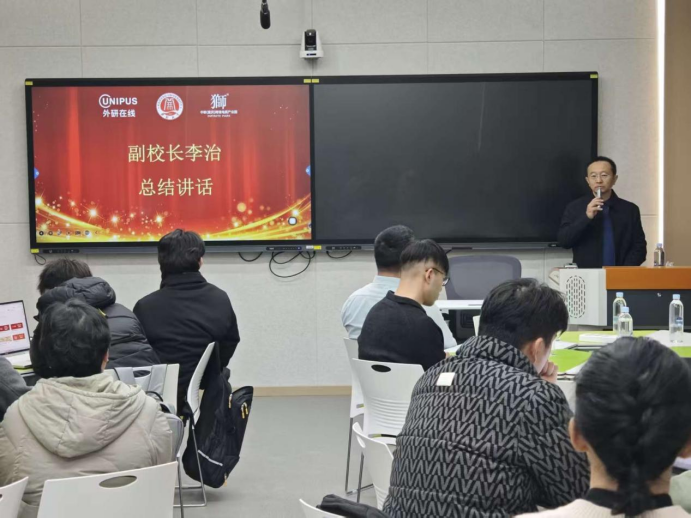 汇报环节结束后,副校长李治发表总结讲话。他首先对跨境电商实训营第一阶段的顺利结课表示祝贺,对国际教育学院(外国语学院)为实训营筹备与实施所付出的努力、外研在线及shopee官方服务商给予的支持表示感谢。李治指出,跨境电商作为数字经济时代的新兴业态,发展潜力巨大,我校开设跨境电商实训营,是响应国家职业教育改革号召、深化产教融合、培养适应行业发展需求的复合型人才的重要举措。他对全体参训学生在第一阶段实训中展现出的学习热情和取得的进步给予高度评价,鼓励学生们珍惜后续实训机会,持续深耕专业知识,强化实操技能,主动适应行业发展节奏,努力成长为具备国际视野、专业素养和创新能力的跨境电商人才。同时,他要求学院进一步优化实训方案,加强与企业的深度合作,不断提升实训质量,为学生就业创业搭建更广阔的平台。