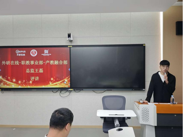 随后,外研在线产教融合部对外合作总监王磊上台讲话。他表示,外研在线始终致力于推动产教融合、校企合作,此次与我校联合举办跨境电商实训营,是双方优势互补、资源共享的重要实践。王磊结合当前跨境电商行业的发展趋势和企业人才需求标准,对学生们的实训成果给予了充分认可,同时分享了行业前沿动态和企业实操经验。他表示,外研在线将持续为实训营提供优质的教学资源、技术支持和企业导师指导,助力学生将理论知识与企业实际需求紧密结合,提升就业竞争力。他希望同学们能够保持学习的主动性和积极性,在实训中积累实战经验,为未来步入职场打下坚实基础,也期待与我校进一步深化合作,共同培养更多优秀的跨境电商专业人才。