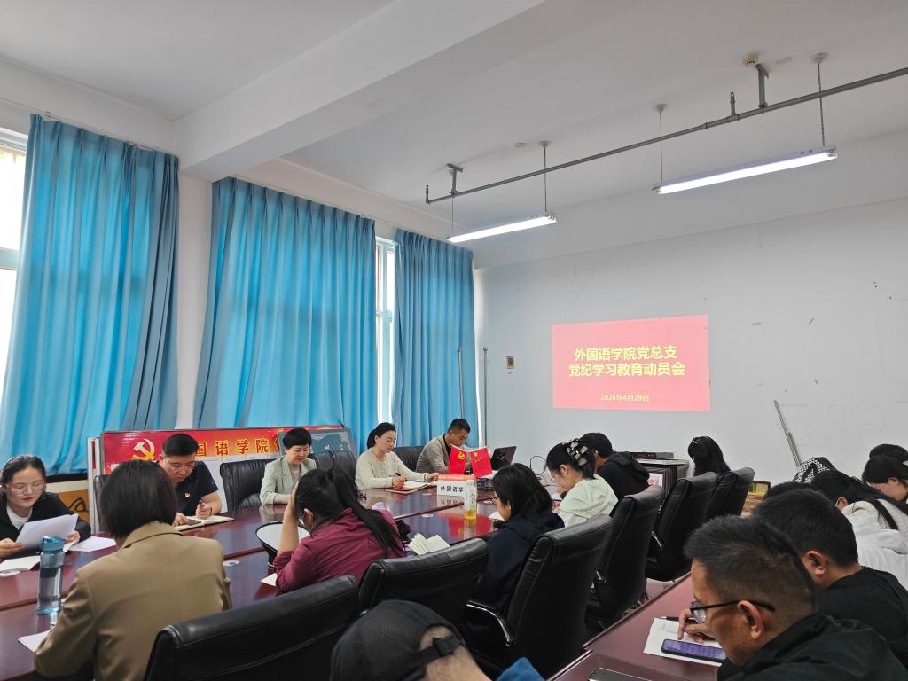 4月29日下午,外国语学院在17号楼会议室召开党纪学习教育动员会,旨在全面部署并推进学院党纪学习教育工作,学院全体党员参加会议,会议由学院副院长、组织委员郭俊霞主持。