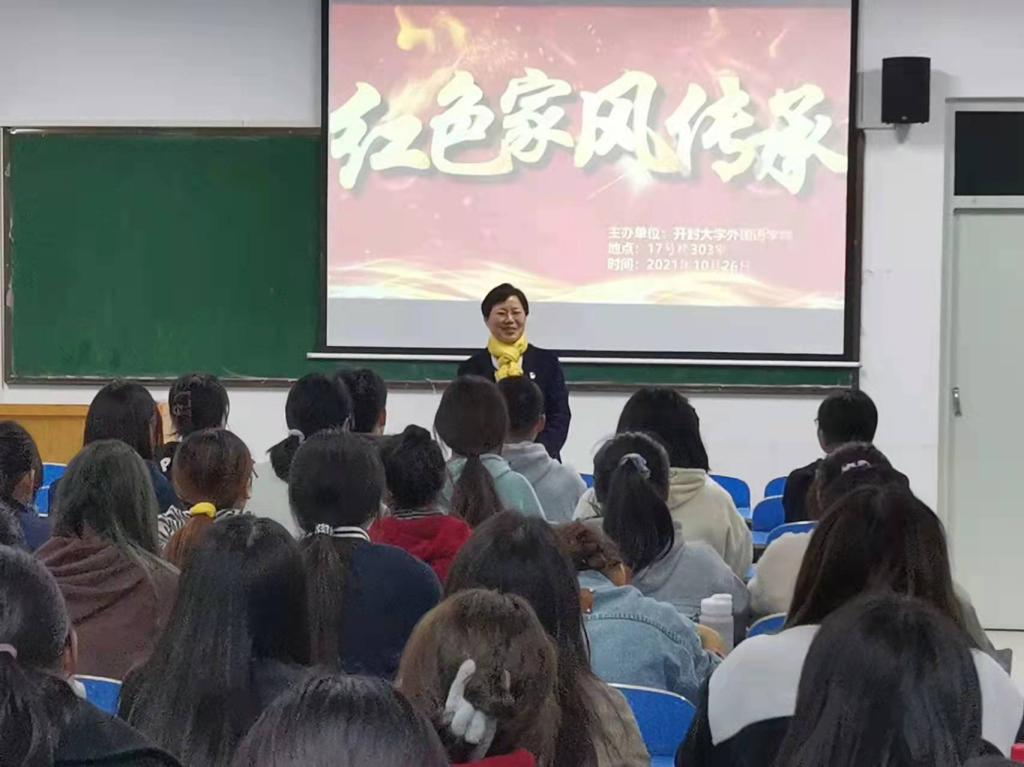 学院领导班子成员、辅导员、组织员和班级导师分别深入到自己所联系的班级,以主题班会、微党课、分享交流会等不同形式进行宣讲。10月26日学院党总支书记孟祥茹在17号楼303教室与20级应用英语专业学生分享了“生命熄灭的交代——红军老战士曾志的遗书”红色家风故事,引导学生深入思考生命的意义,树立正确的人生观、价值观,不负韶华,刻苦学习,提升技能,服务社会。外国语学院副院长韩超、秦新峰、司海舸等老师也分别与学生分享了革命前辈的红色家风故事,引领同学们传承红色家风,厚植家国情怀,加强个人修养,在红色基因中汲取前进的力量,砥砺品格,继往开来,开拓创新,做有理想、有本领、有担当的新时代大学生。