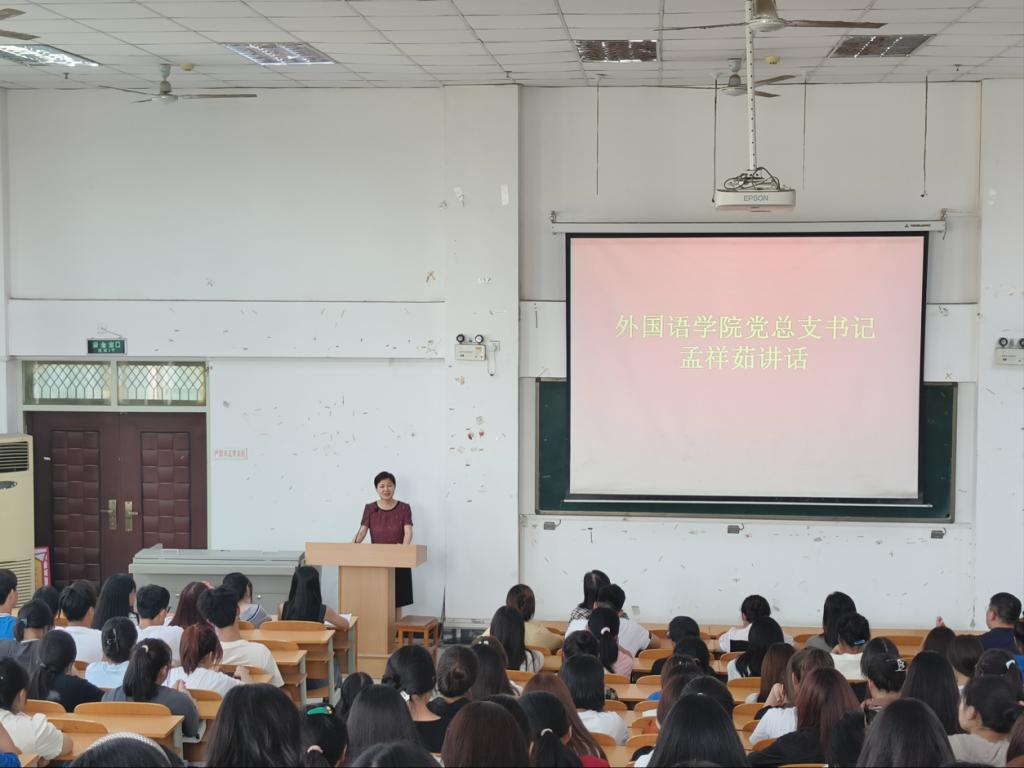 接着,外国语学院党总支书记孟祥茹同志提出寄语。她表示大学生正处于学习的黄金时期,要把学习作为首要任务,筑牢思想根基,夯实理论功底,积累专业知识,真正做到厚积而薄发。她希望同学们尽早明确未来的职业定位和人生目标,始终保持对未知的探索与创新精神,以昂扬的姿态投身中国式现代化伟大事业,在青春的赛道上、在中华民族伟大复兴的道路上奋力奔跑!